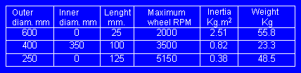Description of the dynamometer.it is a robust metallic frame on which all the components mount. The fundamental element of the dynamometer is the axis, in which has mounted the inertial wheel, the brake, the starting gear tooth and the chain wheel that will connect the engine with the axis. No clutch between the motor and the inertial wheel exist. Clutches are expensive and complicated to mount, the design of this dynamometer has optimized so that clutch are not necessary. Clutches are used to disconnect the inertial wheel of the rest of the assembly during the starting, and to disconnect the engine of the assembly when finalizing the test so that inertial wheel does not drag the engine to high revolutions while it brake and with the carburetor closed and its consequent problems of lubrication (it remembers that oil enters with gasoline). Reducing inertia of the inertial wheel then the starter engine is able to accelerate the assembly. This reduction of inertia is compensated with an increase of wheel revolutions. With a big automotive air cooler disk brake is possible to reduce the speed of the assembly in few seconds so that it is not dangerous for the engine. The fact to have a inertial wheel with a reduced inertia and that it turns to hi revolutions allows us to stop it in a short time. Design of the inertial wheelFor the design of the inertia wheel we can play with the external diameter, the internal diameter, length and revolutions. Our objective, as it has been said in the previous section, is a inertial wheel with relatively little inertia and therefore a compact and light design so that it allows us to work at hi revolutions without danger. It happens a double benefit, when we fixed a greater objective of inertia wheel revolutions, if we had the same torque applied to the wheel would cost more time to increase same engine rpm, nevertheless when fixing superior revolutions to the wheel we must mount longger ration engine-inertial wheel reason why smaller torque is applied to the wheel. The result is that a small increase of revolutions provides a greater time in the test, this is verified doing calculations: the time of test when the wheel get 1000 maximum rpm with the engine since 2000 rpm to 12000 is of 0,8 seg. for 2000 wheel rpm is of 3,2 and for 4000 wheel rpm seg is of 13,0 seconds. We must arrive at a commitment, for which we will make a table with wheels of different sizes and a common characteristic: an ideal engine of constant torque and 15 cv (12000rpm) expend exactly 10 seg. in arriving at the wheel revolutions marked in the table.