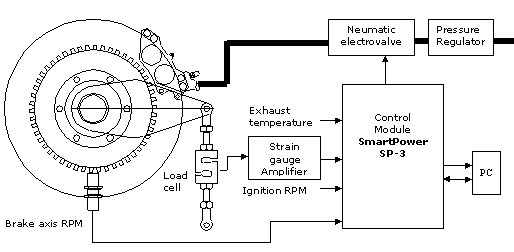 The brake is driven by electrovalve that is controlled by the electronic module, the pneumatic pressure is provided by a regulator where a constant pressure is selected, the torque of braking is linear with the pressure, the optimal pressure experimentally obtains so that the test lasts approximately 10 seconds, for each engine we will always use the same pressure. HorsePower curve test The more accurate way to work with this dynamometer consists of raising the motor the maximum regime and applying the brake until stopping it (automatic actuation). The curve appears in screen from RPM max to engine stop. info@sportdevices.com to contact SportDevices.com 08/25/03 |